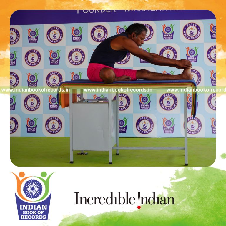 The Longest Duration Holding Vama Mahamudra Yoga Pose on a Table by an Individual (Male) lasted for 3 Minutes and 2 Seconds. It was accomplished by Dr.V.Gunasekaran, Founder-Maragatham Yogalayam at Udumalpet, Tirupur District, Tamil Nadu, India on September 27, 2019.