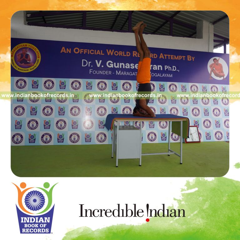 The Longest Duration Holding Vama Parivrtaikapata Sirsasana Yoga Pose Blindfolded on a Table by an Individual (Male) lasted for 3 Minutes and 1 Second. It was accomplished by Dr.V.Gunasekaran, Founder-Maragatham Yogalayam at Udumalpet, Tirupur District, Tamil Nadu, India on September 26, 2019.