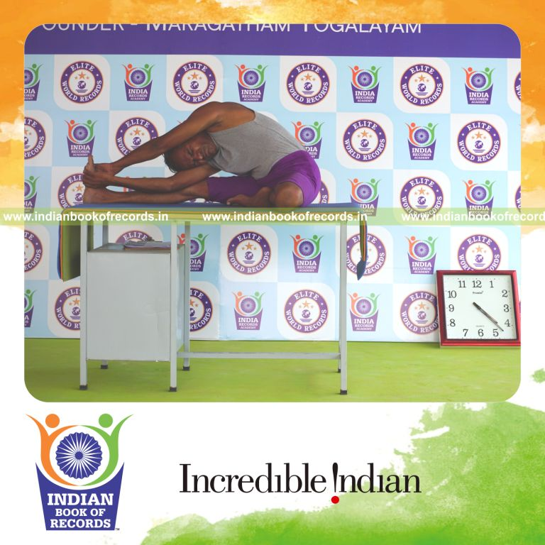 The Longest Duration Holding Vama Parivrtta Janu Sirsasana Yoga Pose on a Table by an Individual (Male) lasted for 4 Minutes and 5 Seconds. It was accomplished by Dr.V.Gunasekaran, Founder-Maragatham Yogalayam at Udumalpet, Tirupur District, Tamil Nadu, India on September 22, 2019.
