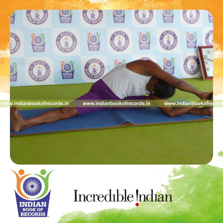 The Longest Duration Holding Vama Parivrtta Upavistha Konasana Yoga Pose Blindfolded by an Individual (Male) lasted for 3 Minutes and 5 Seconds. It was accomplished by Dr.V.Gunasekaran, Founder-Maragatham Yogalayam at Udumalpet, Tirupur District, Tamil Nadu, India on September 22, 2019.