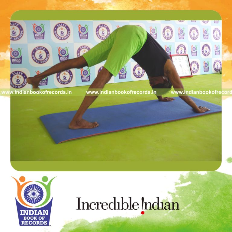 The Longest Duration Holding Vama Parsva Ekapada Adho Mukha Svanasana Yoga Pose Blindfolded by an Individual (Male) lasted for 3 Minutes. It was accomplished by Dr.V.Gunasekaran, Founder-Maragatham Yogalayam at Udumalpet, Tirupur District, Tamil Nadu, India on September 15, 2019.