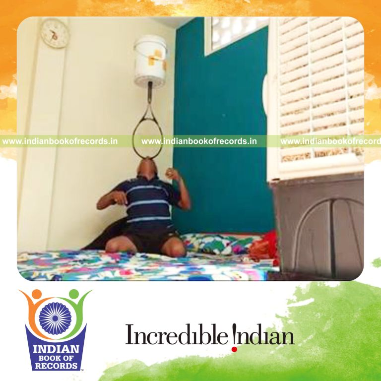 The Longest Time Balancing a Five Gallon Bucket on top of Tennis Racquet on Chin while Kneeling lasted for 2 minutes and 20.50 seconds. It was accomplished by Suresh Gaur at Gwalior, Madhya Pradesh, India on June 24, 2017.