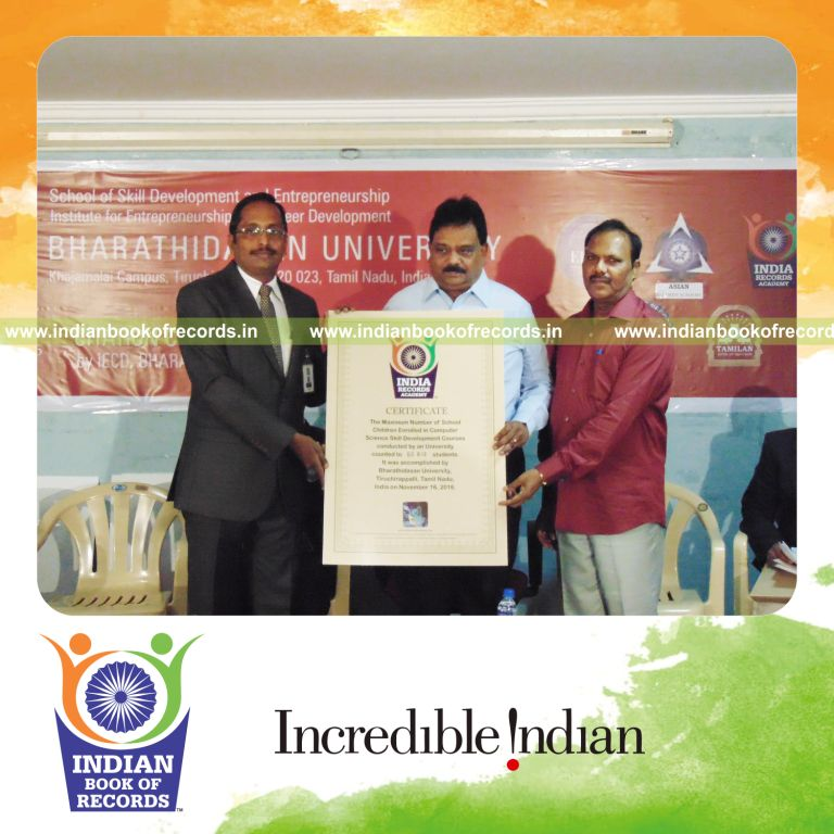 The Maximum Number of School Students Enrolled in Skill Development Course of a University in an Academic Year counted to 82812 students. It was accomplished by Bharathidasan University, Tiruchirappalli, Tamil Nadu, India on November 16, 2016.