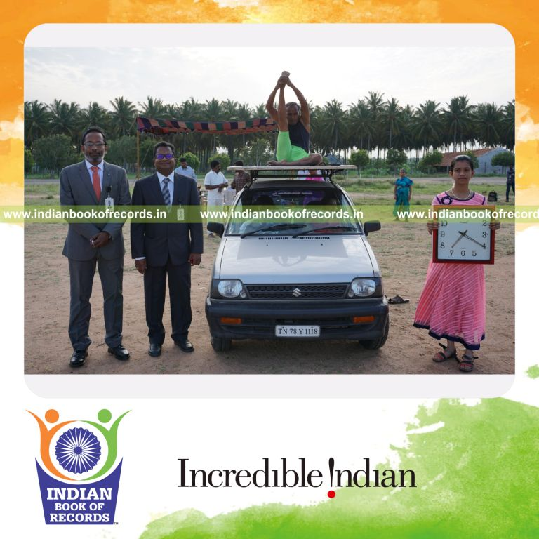 The Maximum Number of Yogasanas Performed on a Moving Car by an Individual (Male) in 5 Minutes counted to 28 asanas. It was accomplished by Dr.V.Gunasekaran, Founder-Maragatham Yogalayam at Udumalpet, Tirupur District, Tamil Nadu, India on September 15, 2019.
