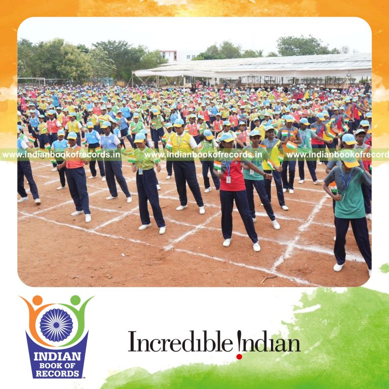 The Maximum Participants Performing in a Sports Drill holding Flags Simultaneously (Single Venue) counted to 1415. It was accomplished by Frontline Schools in Tirupur District, Tamil Nadu, India on July 25, 2023.