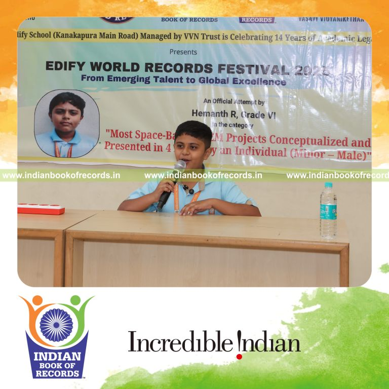 The Maximum Space-Based STEM Projects Conceptualized and Presented in 4 Hours by an Individual (Minor-Male) counted to 48. It was accomplished by Hemanth R, Grade VI, Edify School (Kanakapura Main Road), managed by Vasavi Vidyanikethan Trust in Bengaluru District, Karnataka, India on September 27, 2025.