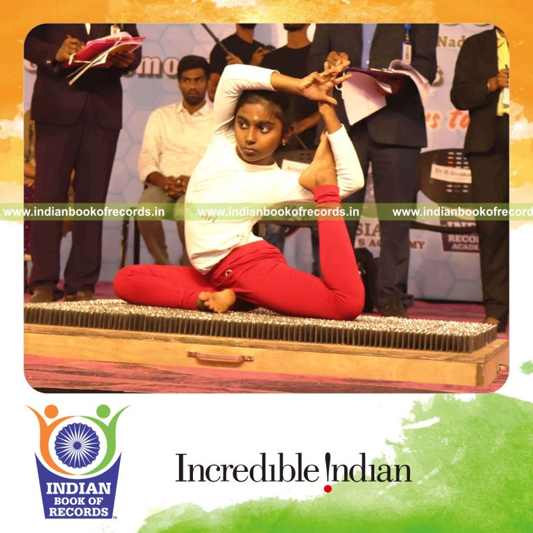 The Maximum Yogasanas Performed on a Nail Bed in 10 Minutes by an Individual (Minor-Female) counted to 140. It was accomplished by Samyuktha Shri.S, Grade VI, Frontline Millennium School in Tirupur District, Tamil Nadu, India on July 23, 2023.