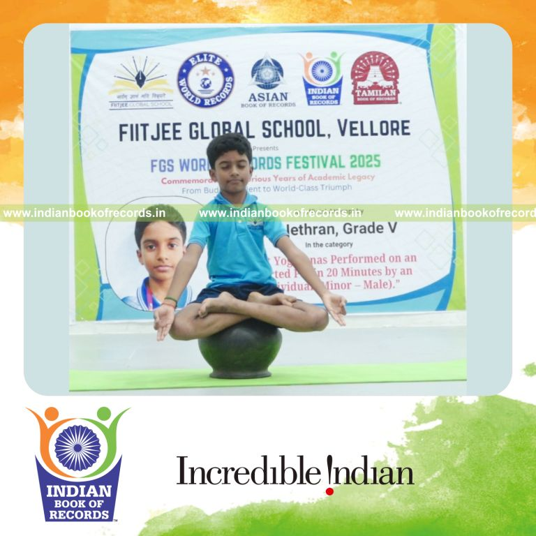 The Maximum Yogasanas performed on an Inverted Pot in 20 Minutes by an Individual (Minor-Male) counted to 118. It was accomplished by P. Nethran, Grade-V, FIITJEE Global School in Vellore District, Tamil Nadu, India on November 15, 2025.