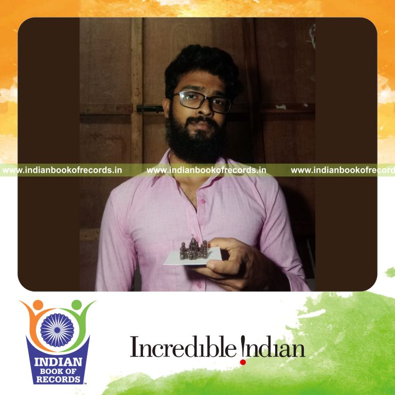 The Smallest Replica of Victoria Memorial Created Using Cow Dung Material (Male) measured 3.5 cm in height and 4.5 cm in width. It was accomplished by Debanjan Maiti from Kolkata, West Bengal, India, on July 27, 2021.